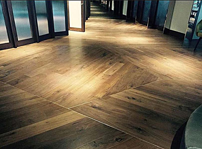Our Engineered Oak Floor featured an intricate and unique design, planks in opposing directions with aluminium feature strips.